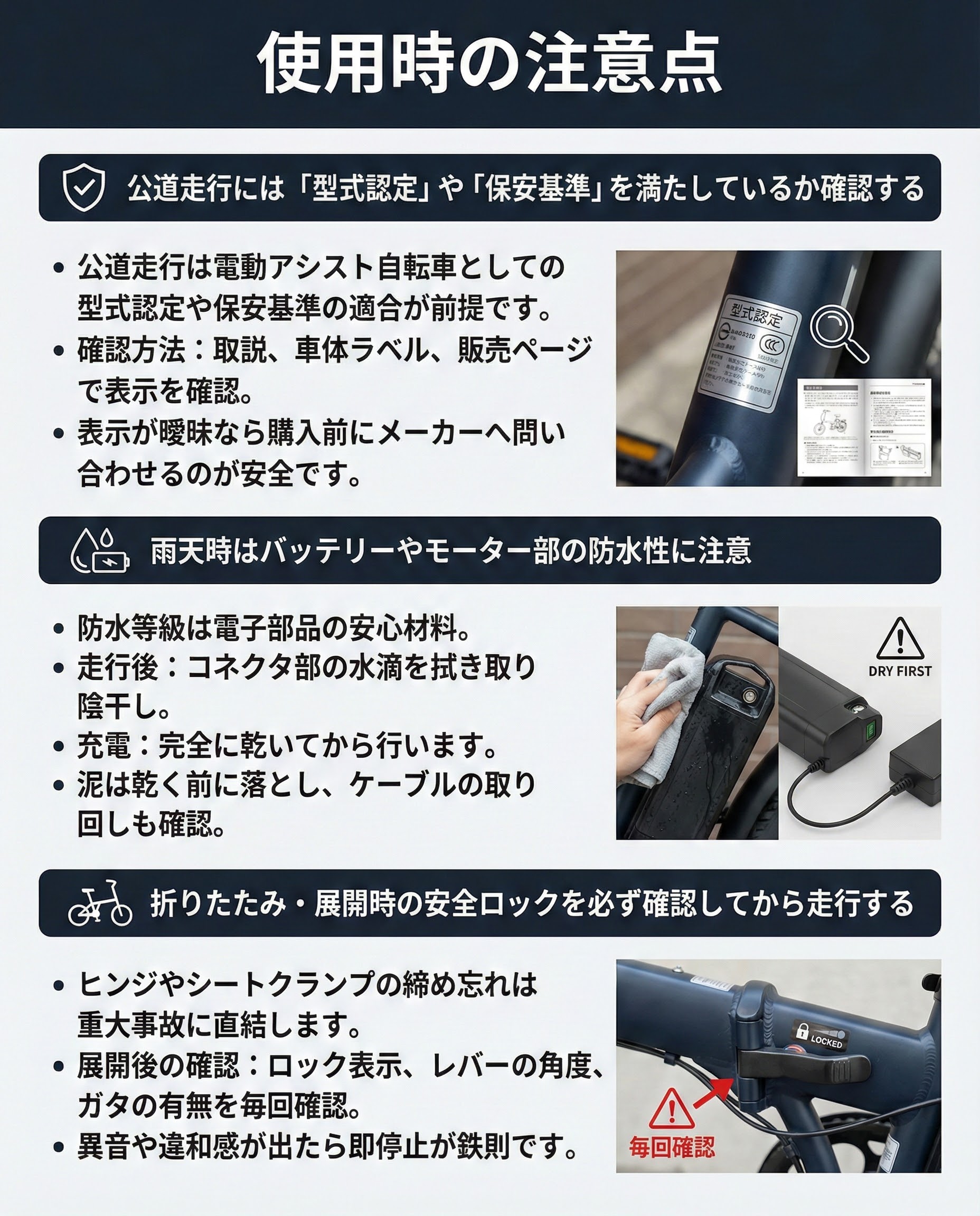 折りたたみヒンジやシートクランプの締め忘れは重大事故に直結します。展開後はロック表示・レバーの角度・ガタの有無を毎回確認。朝の急ぎでも10秒の点検で安心が違いました。異音や違和感が出たら即停止が鉄則です。