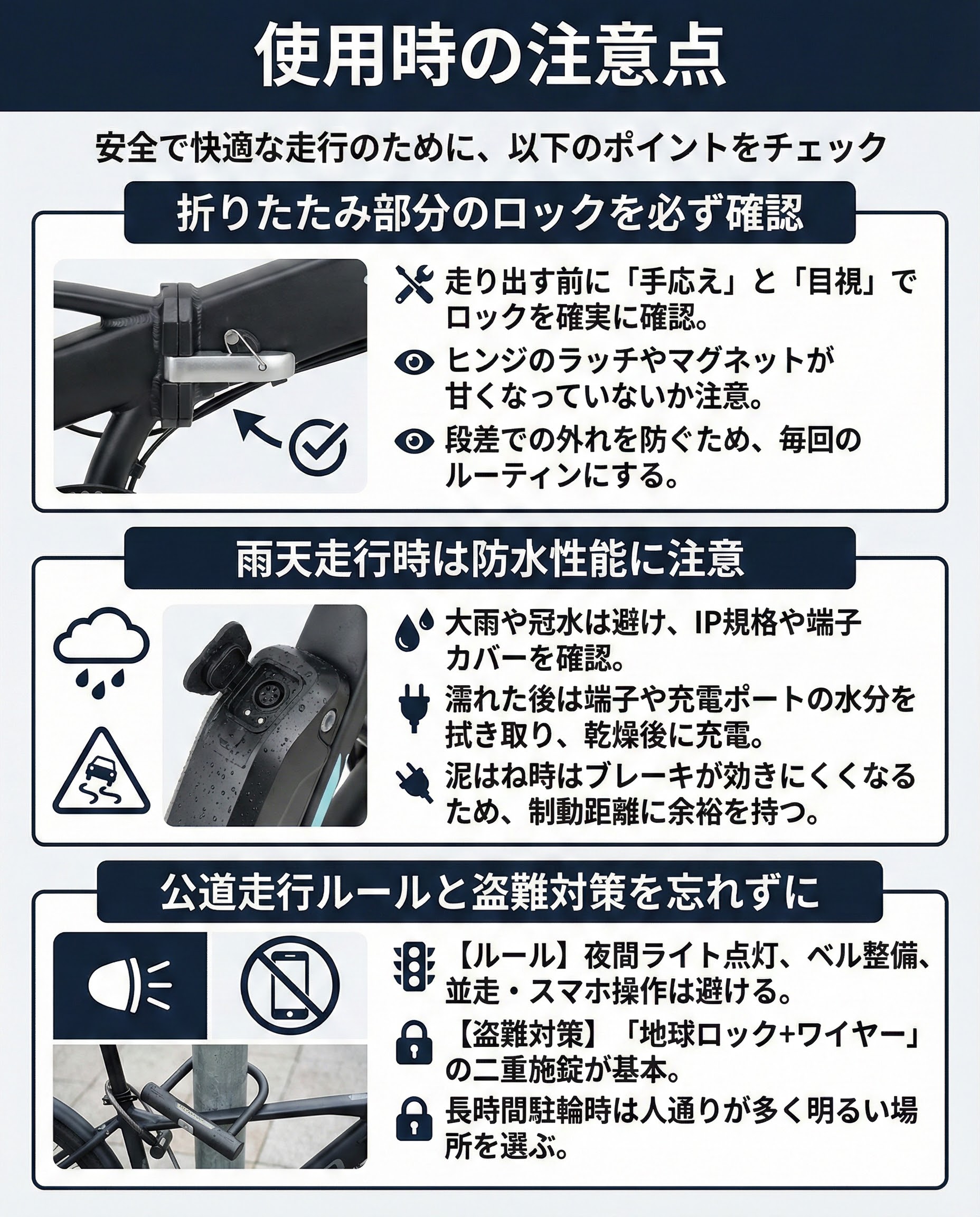 畳み直後はヒンジのラッチやマグネットが甘くなりがちです。走り出す前にロックの「手応え」と「目視」をセットで確認。段差で外れると危険なので、毎回のルーティンにしましょう。