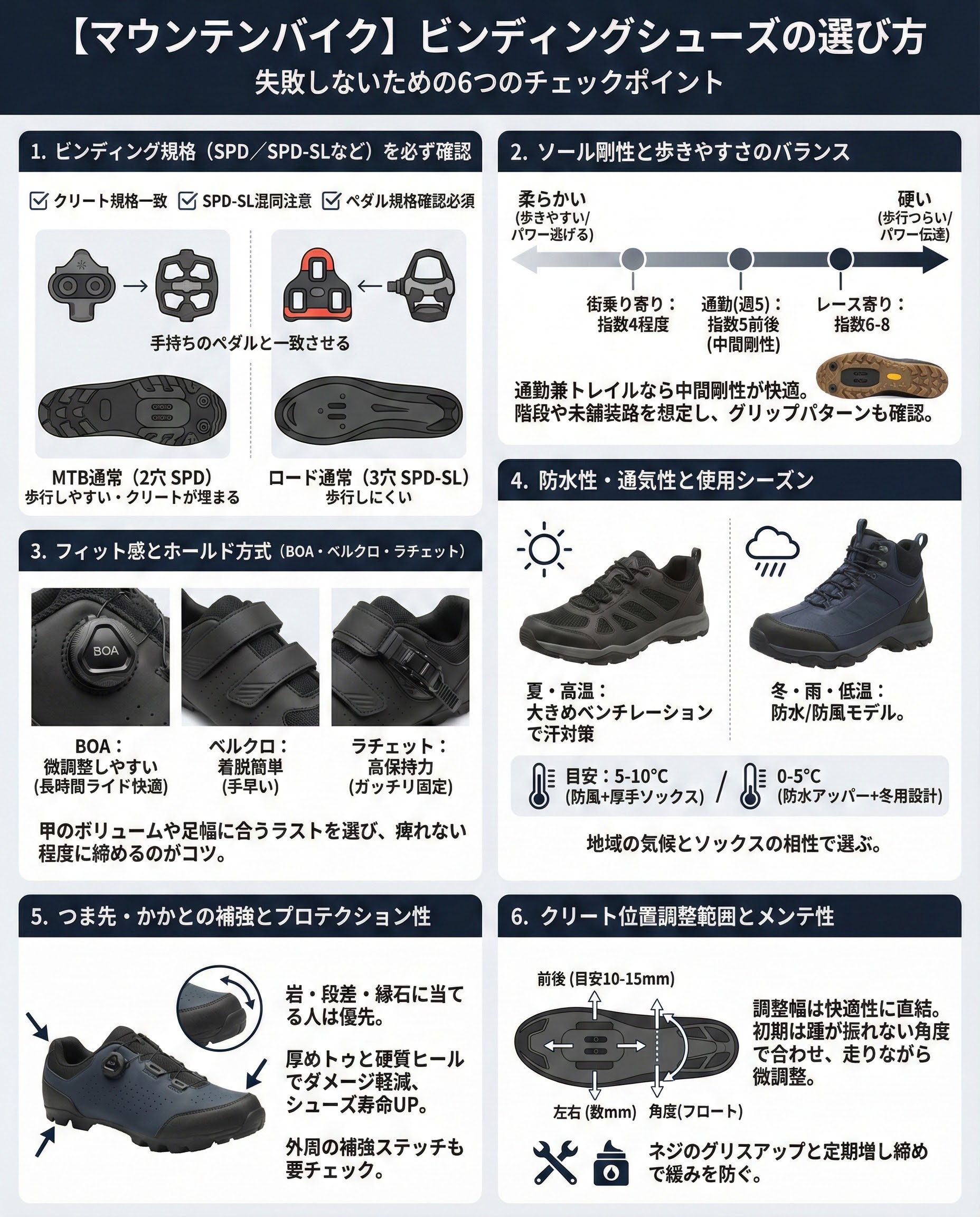 MTBは通常2穴のSPD、ロードは3穴のSPD-SLです。手持ちのペダル規格とクリート規格をまず一致させましょう。歩行も重視するなら、クリートがソールに埋まるSPD系が扱いやすいです。