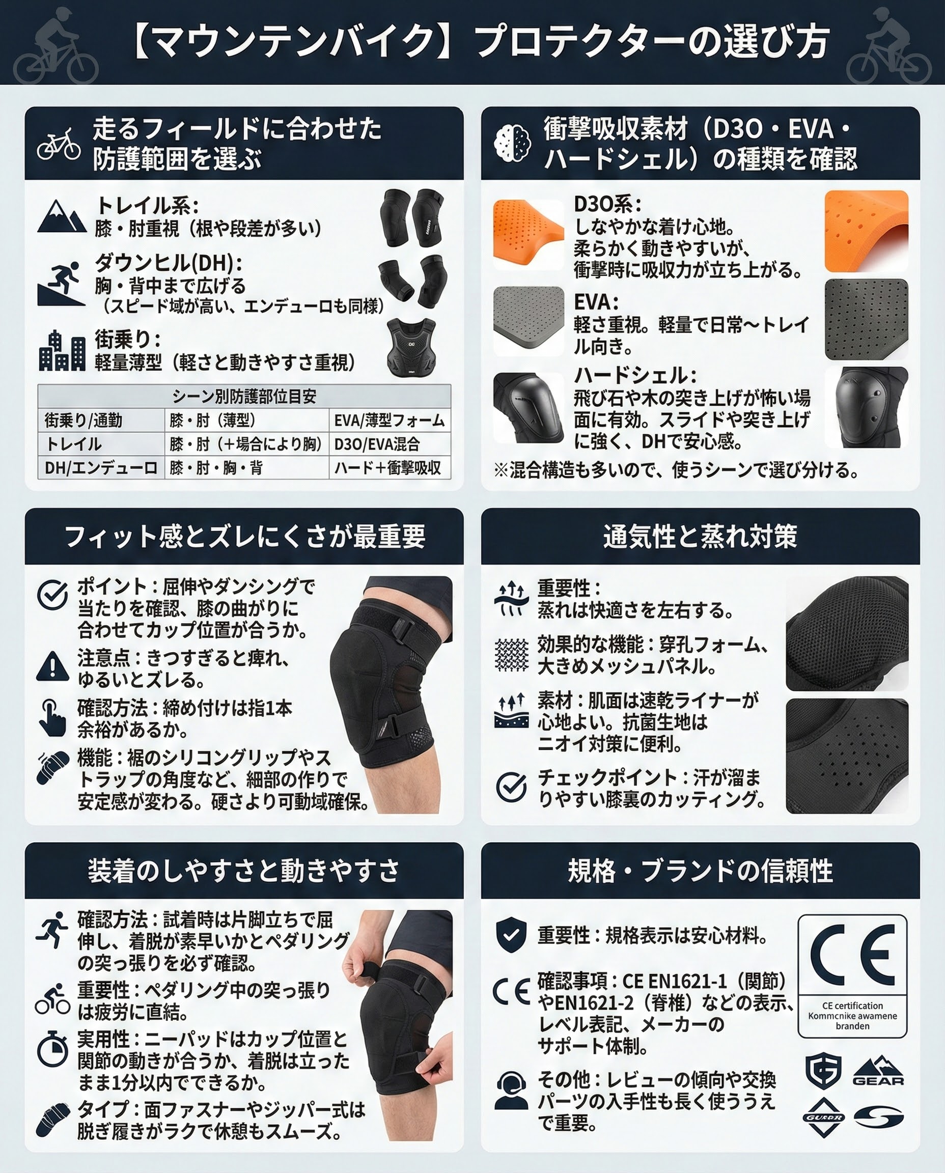 素材には得意分野があります。しなやかな着け心地が欲しいならD3O系、軽さ重視ならEVA、飛び石や木の突き上げが怖い場面はハードシェルが有効でした。混合構造も多いので、使うシーンで選び分けましょう。