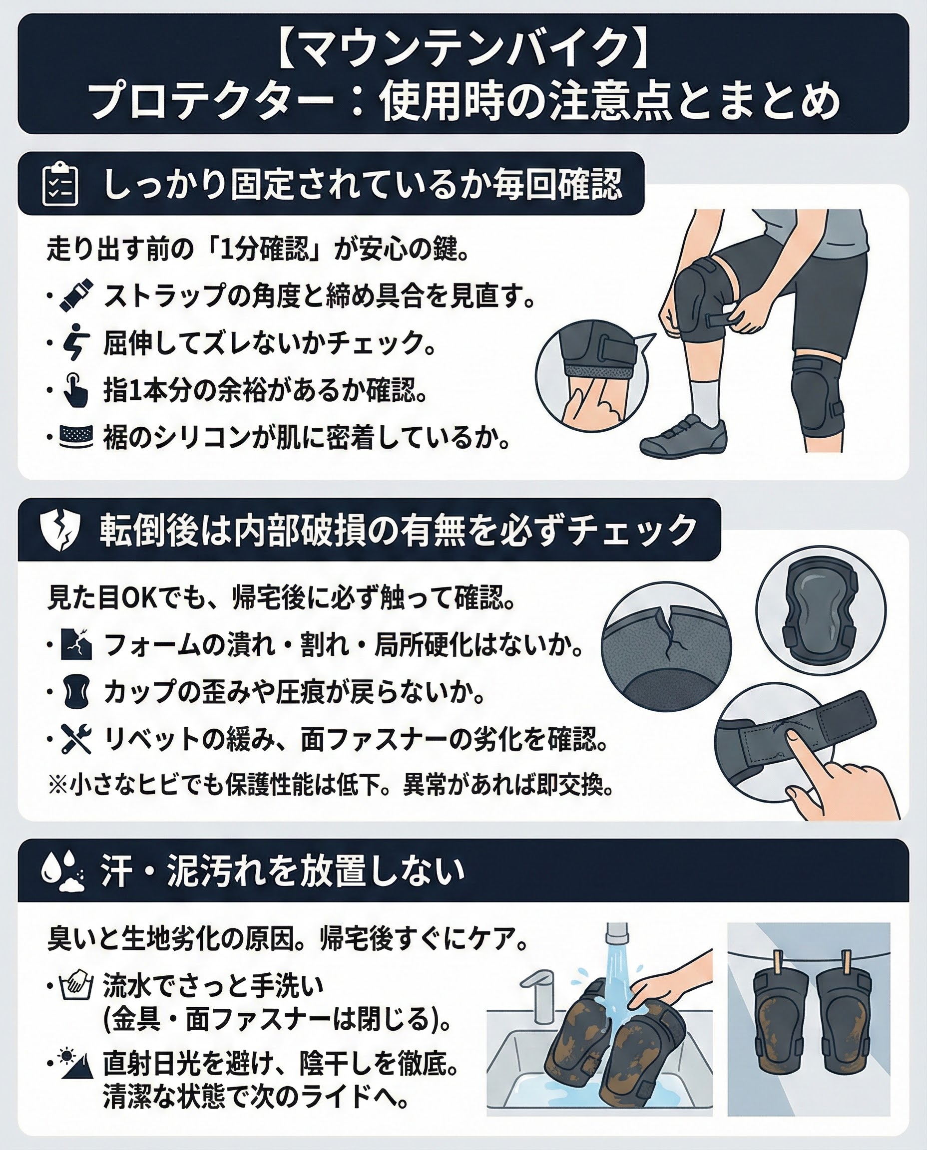 転倒直後はアドレナリンで気づきにくいです。フォームの圧痕が戻らない、甲羅のリベットが緩む、面ファスナーが効かないなどは交換の合図でした。次のライドへ持ち越さず、その日のうちに点検しておくと安心です。