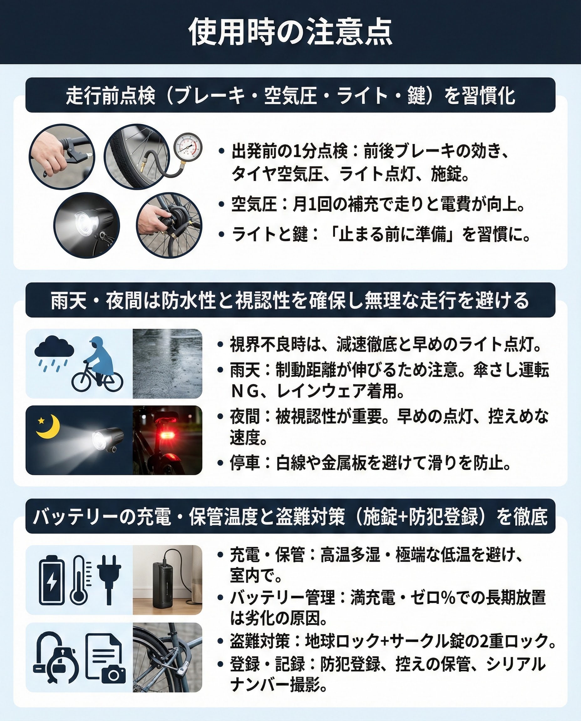 使用時の注意点走行前点検(ブレーキ・空気圧・ライト・鍵)を習慣化
