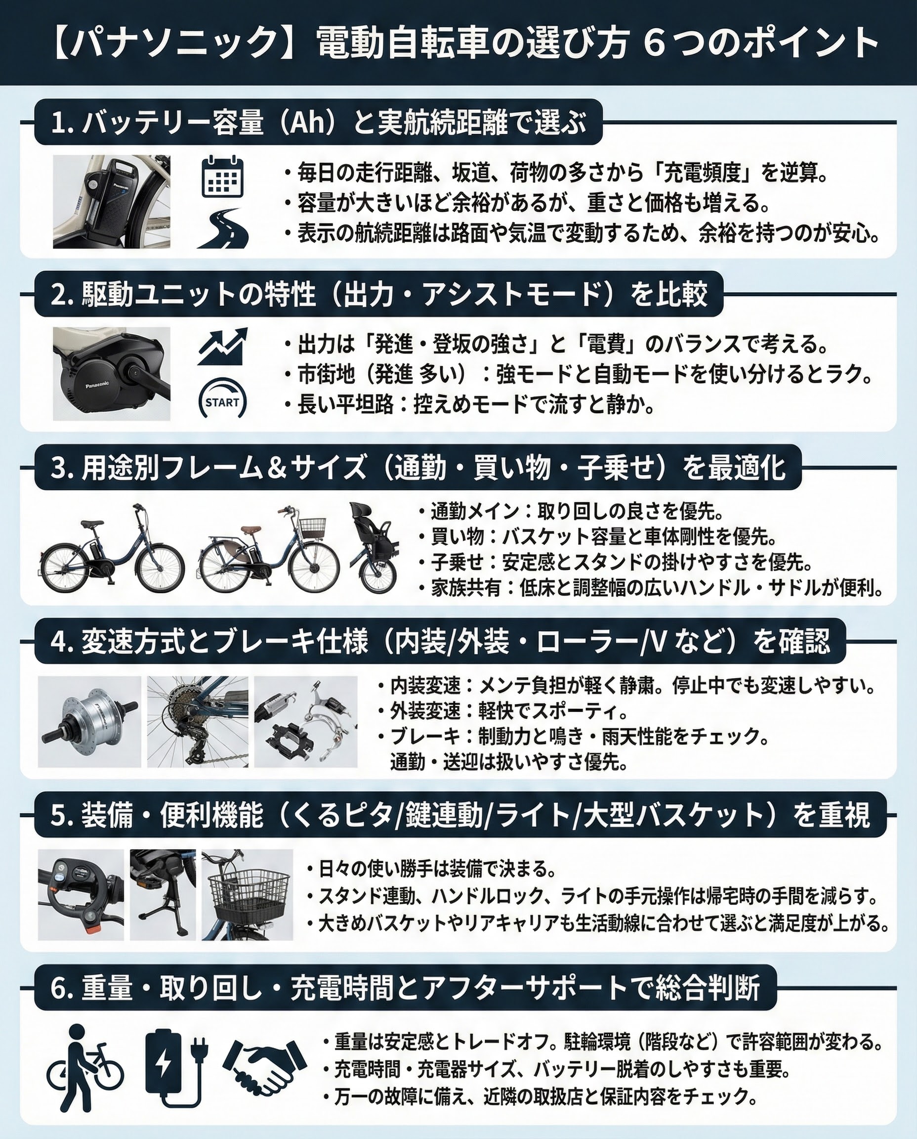 - 選ぶ前に走行距離・坂・積載の条件を明確化